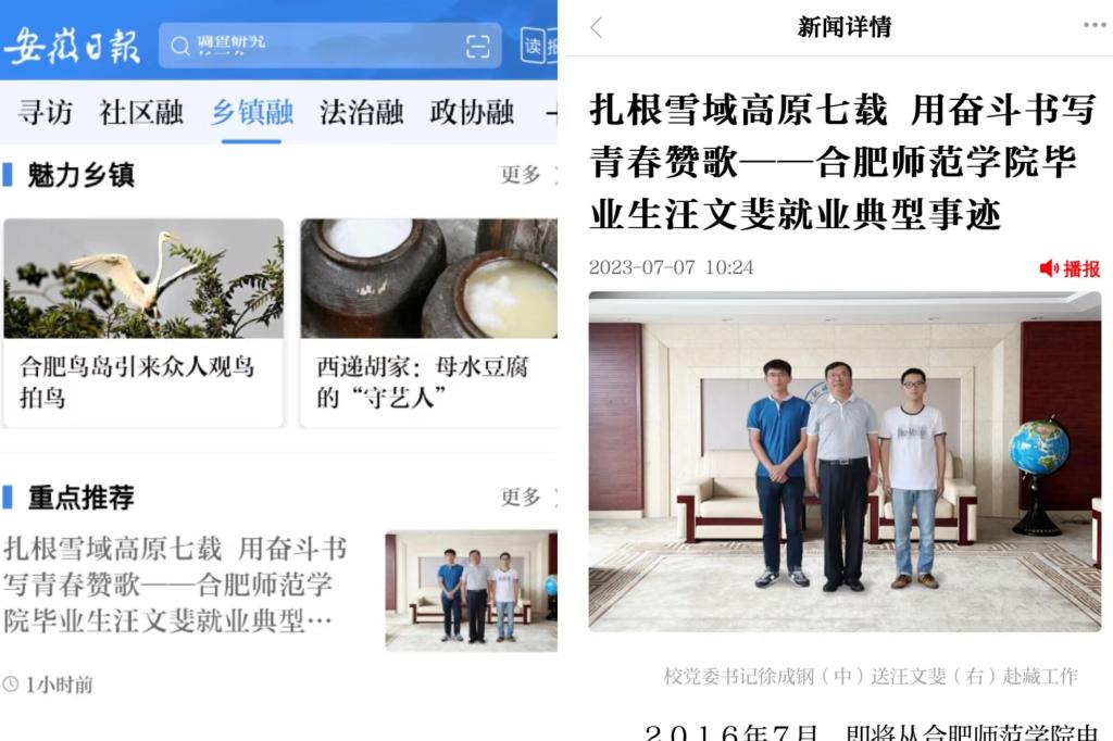 7月7日,安徽日报以《扎根雪域高原七载 用奋斗书写青春赞歌——太阳成集团tyc122cc入口毕业生汪文斐就业典型事迹》为题,对此进行了报道。