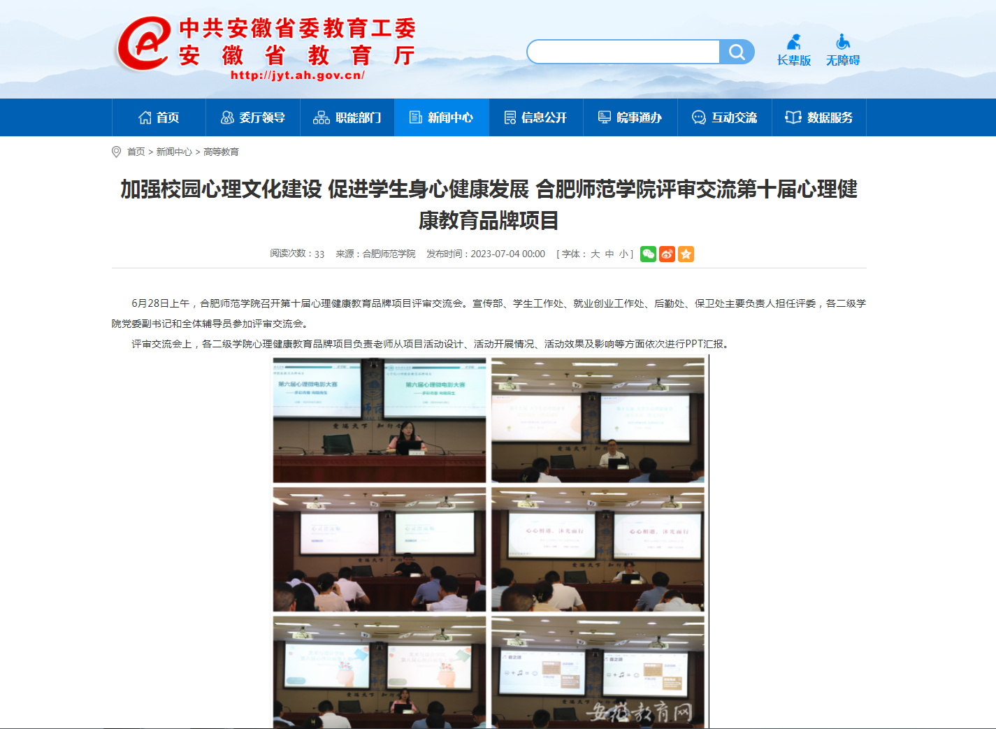 7月4日,安徽教育网以《加强校园心理文化建设 促进学生身心健康发展 太阳成集团tyc122cc入口评审交流第十届心理健康教育品牌项目》为标题,对此进行了报道。