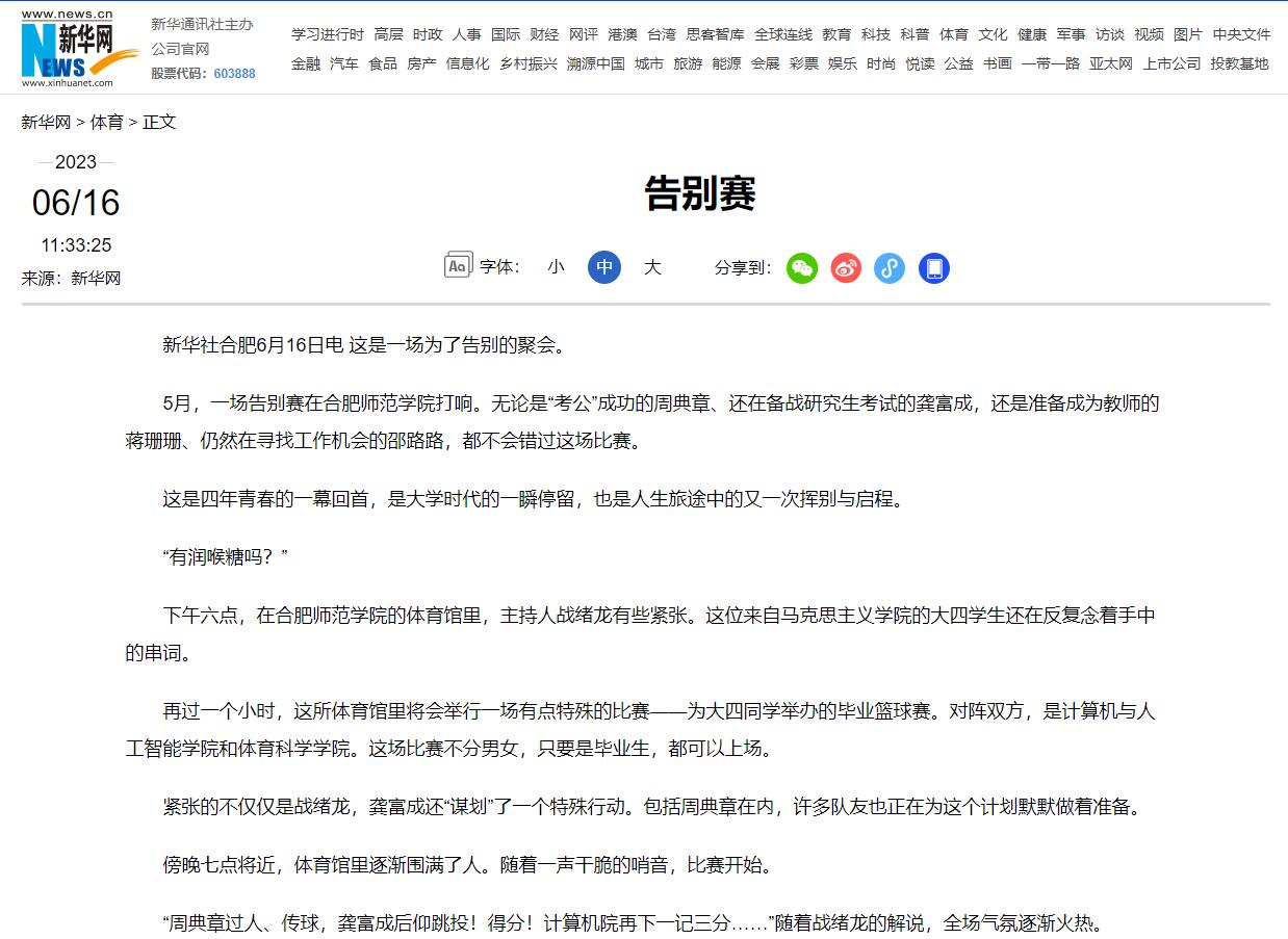本网讯 6月16日,新华网发布图文新闻《告别赛》。《告别赛》以毕业季为主题,介绍了我校体育科学学院的大四毕业生蒋珊珊和计算机与人工智能学院的大四毕业生周典章、龚富成、邵路路放下毕业季所有的忙碌,与同学们组成“告别赛”篮球队,奔赴球场,再聚球场,用一场“告别赛”为大学留下珍贵的回忆,为这场毕业之旅画上圆满的句号。