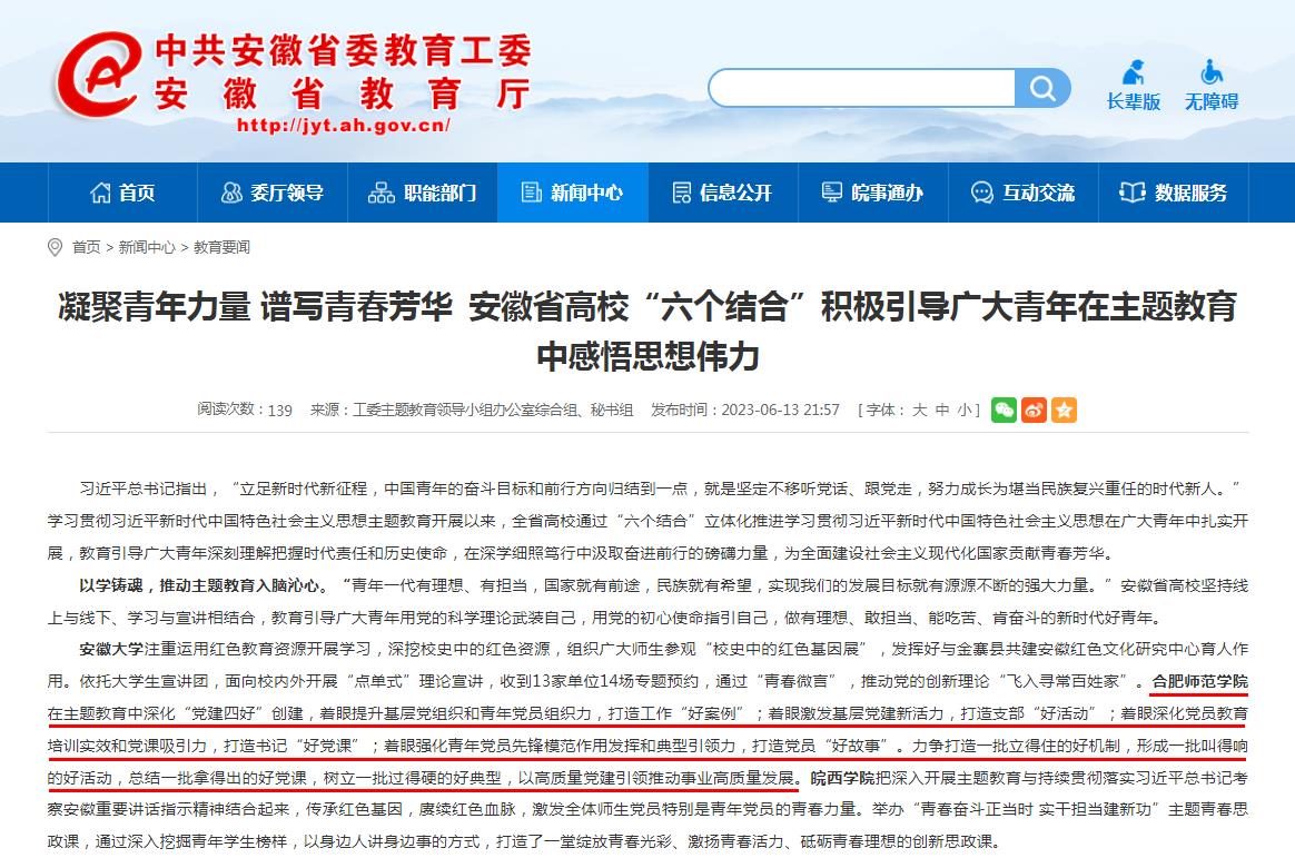 6月13日,安徽教育网以《凝聚青年力量 谱写青春芳华?安徽省高校“六个结合”积极引导广大青年在主题教育中感悟思想伟力》为标题,对此进行了报道。