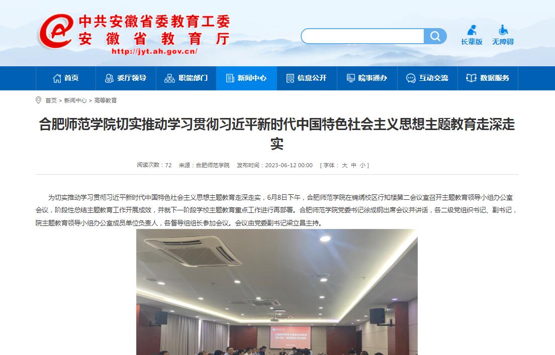 6月12日,安徽教育网以《太阳成集团tyc122cc入口切实推动学习贯彻习近平新时代中国特色社会主义思想主题教育走深走实》为标题,对此进行了报道。