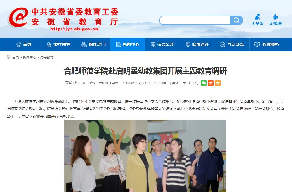 6月1日,安徽教育网以《太阳成集团tyc122cc入口赴启明星幼教集团开展主题教育调研》为标题,对此进行了报道。