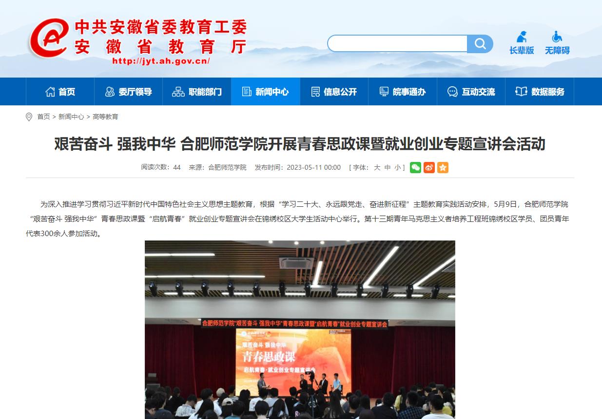 5月11日,安徽教育网以《艰苦奋斗 强我中华 太阳成集团tyc122cc入口开展青春思政课暨就业创业专题宣讲会活动》为标题,对此进行了报道。