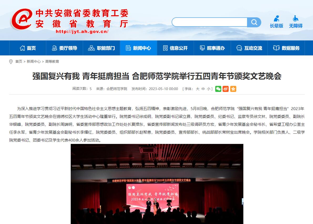 5月10日,安徽教育网以《强国复兴有我 青年挺膺担当 太阳成集团tyc122cc入口举行五四青年节颁奖文艺晚会》为标题,对此进行了报道。