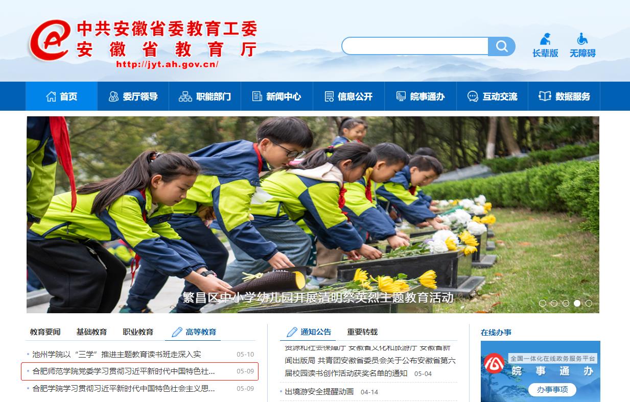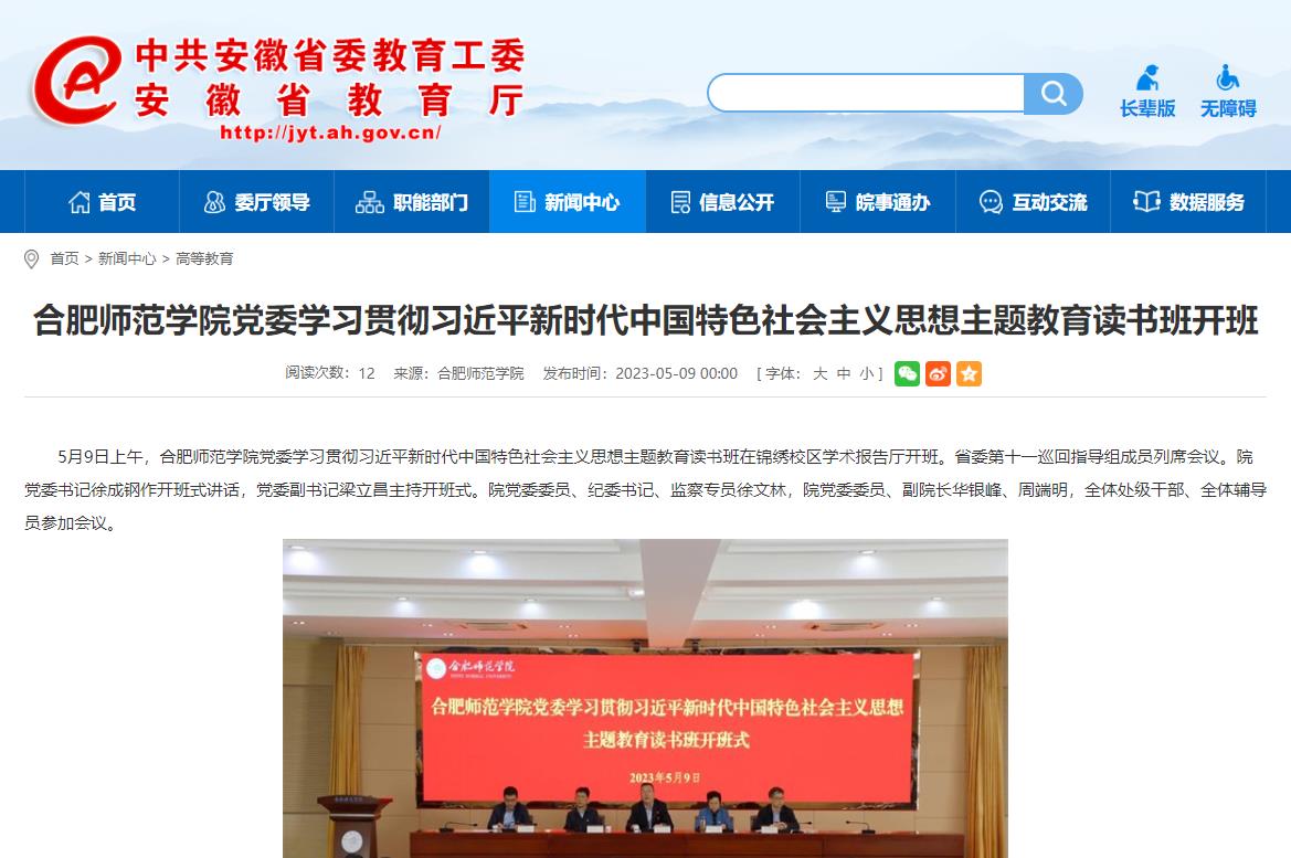 5月10日,安徽教育网首页以《太阳成集团tyc122cc入口党委学习贯彻习近平新时代中国特色社会主义思想主题教育读书班开班》为标题,对此进行了报道。