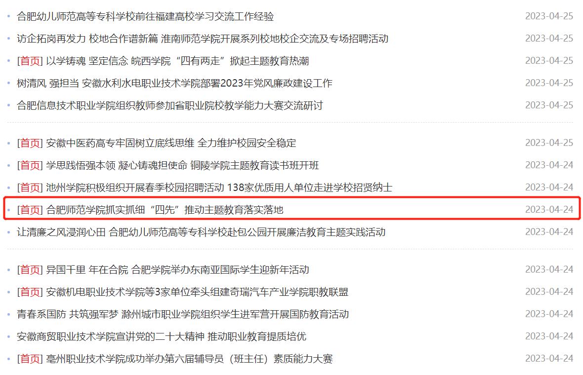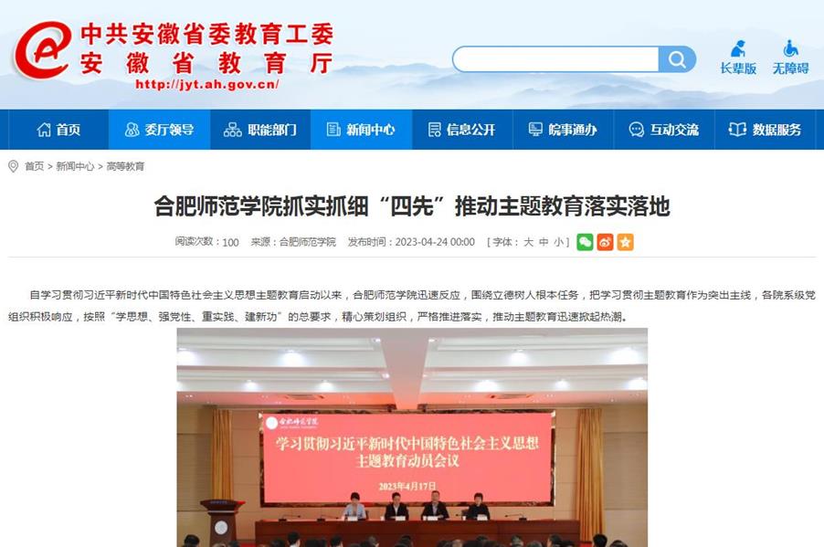 4月26日,安徽教育网首页以《太阳成集团tyc122cc入口抓实抓细“四先”推动主题教育落实落地》为标题,对此进行了报道。