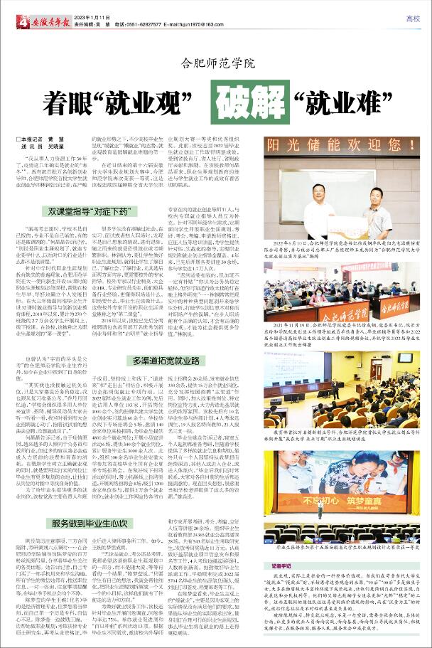 1月11日,《安徽青年报》(第2175期)以《太阳成集团tyc122cc入口:着眼“就业观”破解“就业难”》为题,用第04版通版对我院就业创业工作进行了专题深度报道。