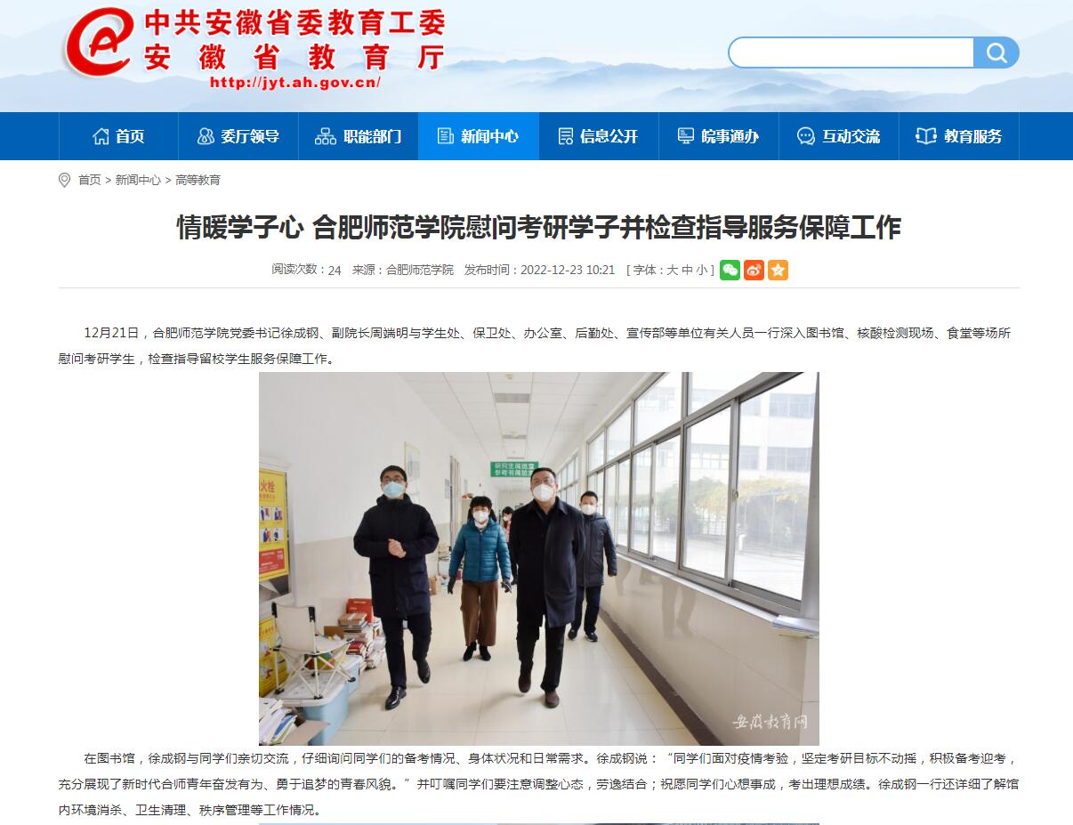 12月23日,安徽教育网以《情暖学子心 太阳成集团tyc122cc入口慰问考研学子并检查指导服务保障工作》为标题,对此进行了报道。