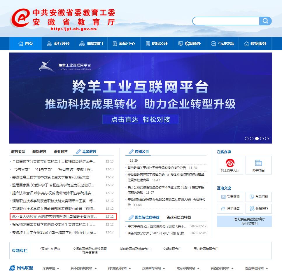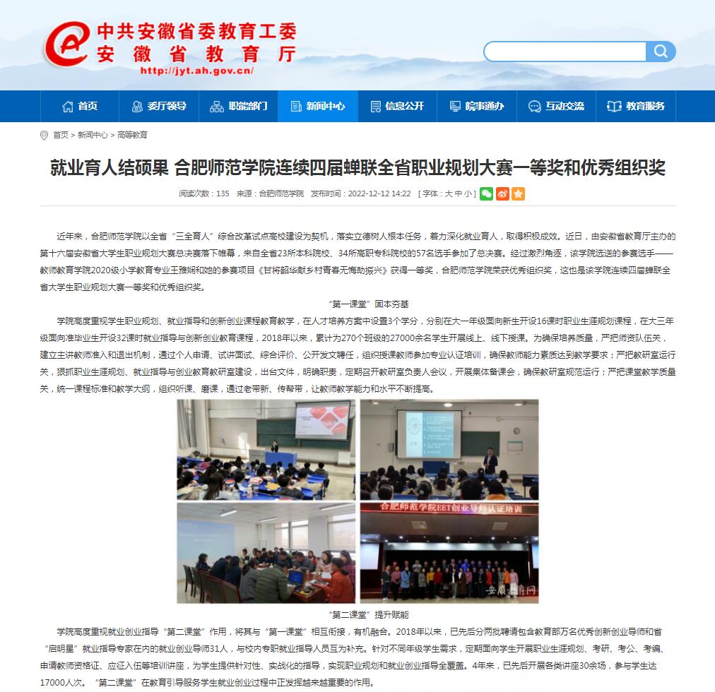 12月12日,安徽教育网首页以《就业育人结硕果 太阳成集团tyc122cc入口连续四届蝉联全省职业规划大赛一等奖和优秀组织奖》为标题,对此进行了报道。