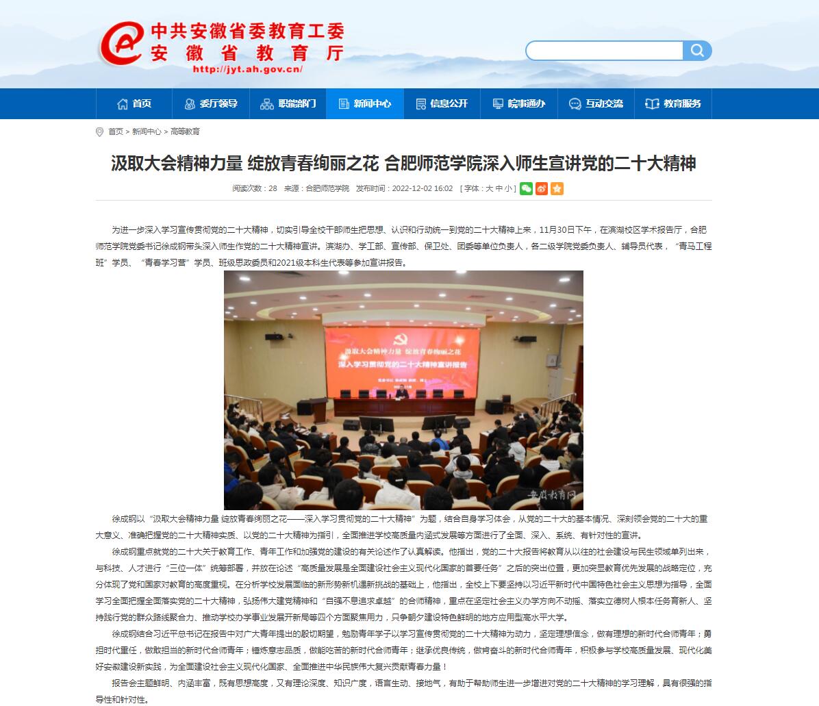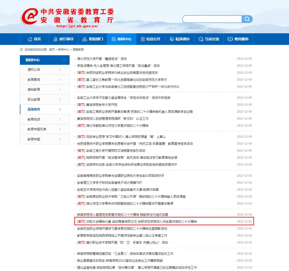 12月2日,安徽教育网首页以《汲取大会精神力量 绽放青春绚丽之花 太阳成集团tyc122cc入口深入师生宣讲党的二十大精神》为标题,对此进行了报道。