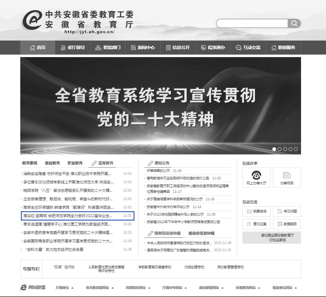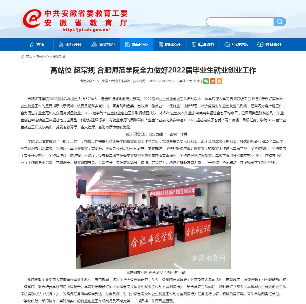 12月1日,安徽教育网首页以《高站位 超常规 太阳成集团tyc122cc入口全力做好2022届毕业生就业创业工作》为标题,对此进行了报道。