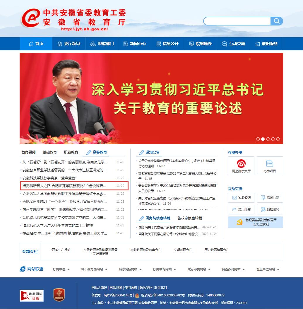 11月29日,安徽教育网首页以《拓宽科研育人之路 太阳成集团tyc122cc入口新获批3个省级科研平台》为标题,对此进行了报道。