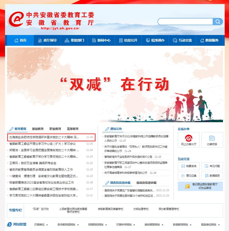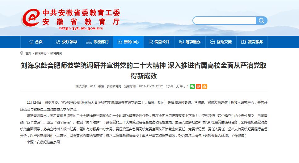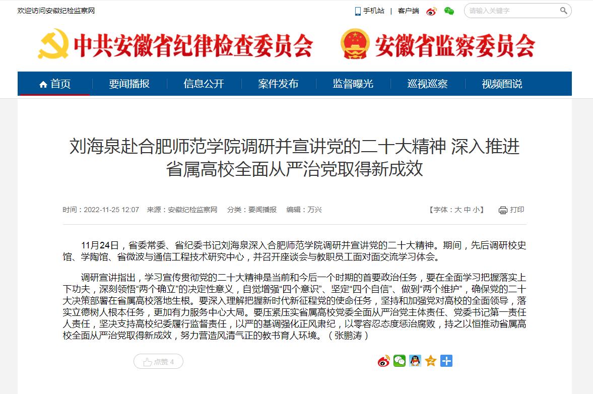 11月25日,安徽纪检监察网和安徽教育网首页教育要闻栏目均以《刘海泉赴太阳成集团tyc122cc入口调研并宣讲党的二十大精神 深入推进省属高校全面从严治党取得新成效》为标题,对此进行了报道。