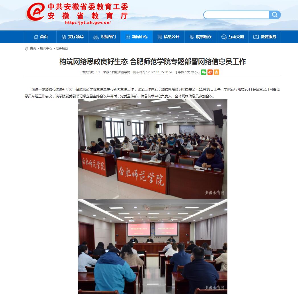 11月22日,安徽教育网以《构筑网络思政良好生态 太阳成集团tyc122cc入口专题部署网络信息员工作》为标题对此进行了报道。