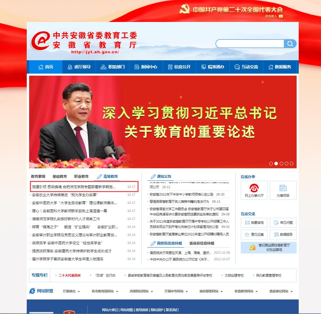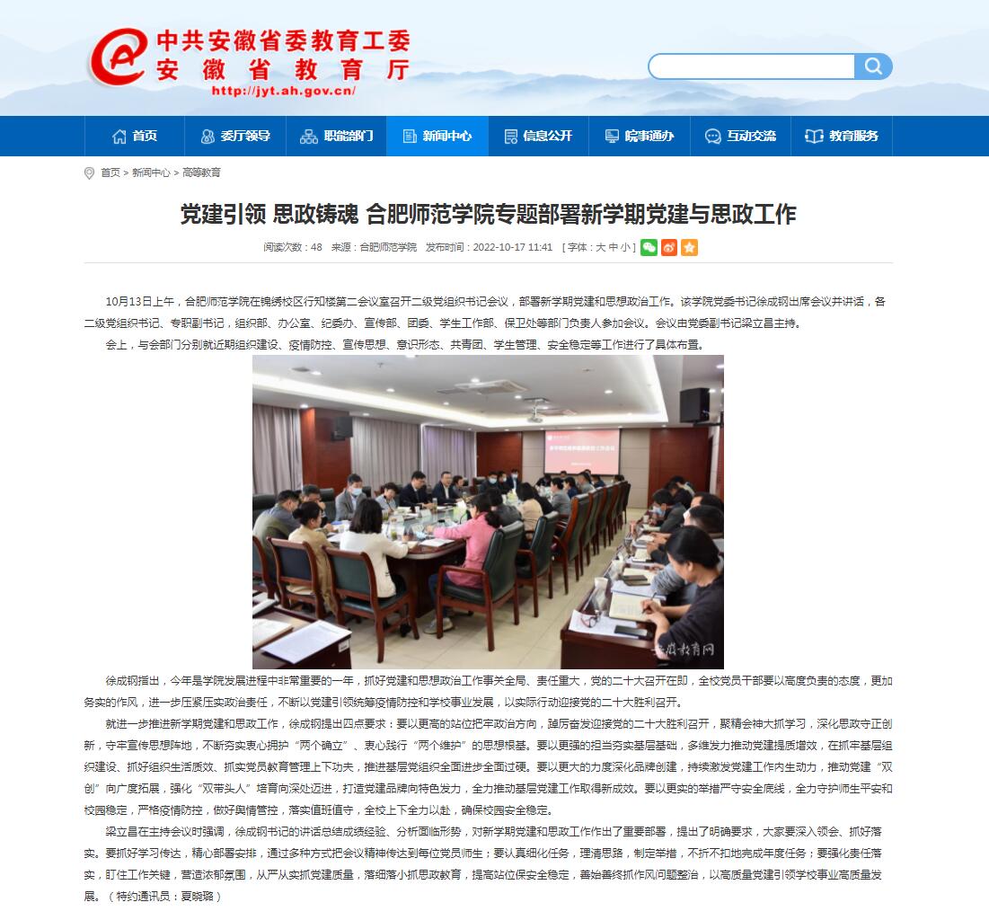 10月17日,安徽教育网首页以《党建引领 思政铸魂 太阳成集团tyc122cc入口专题部署新学期党建与思政工作》为标题进行了报道。