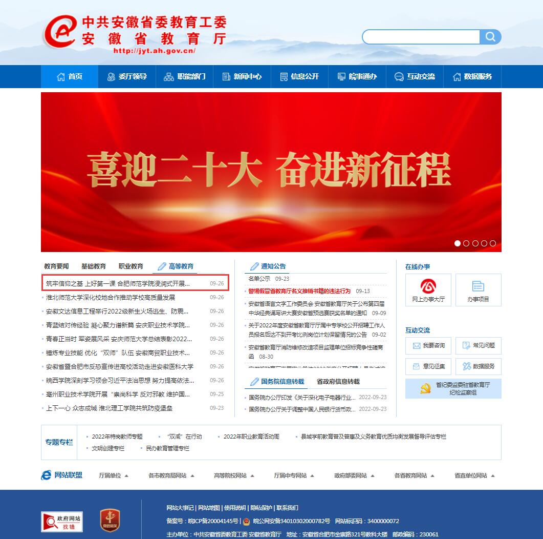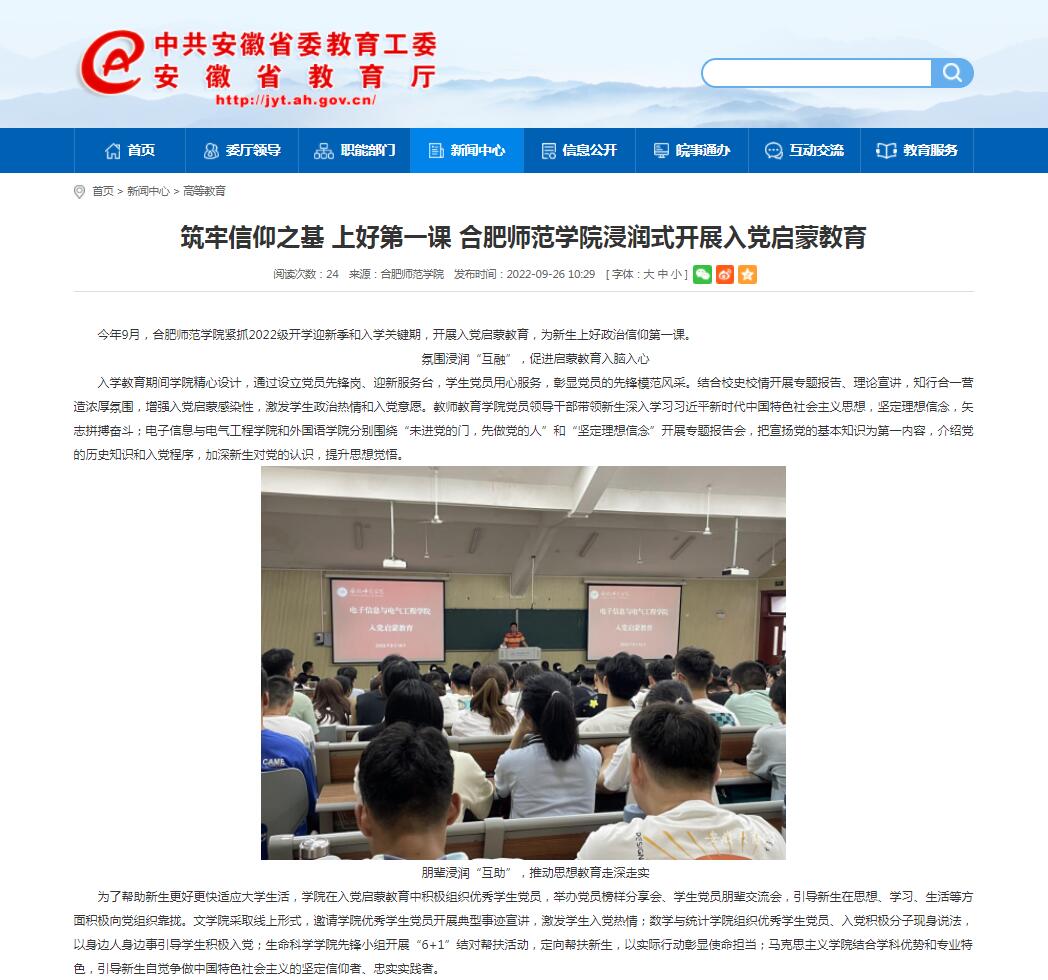 9月26日,安徽教育网首页以《筑牢信仰之基 上好第一课 太阳成集团tyc122cc入口浸润式开展入党启蒙教育》进行了报道。