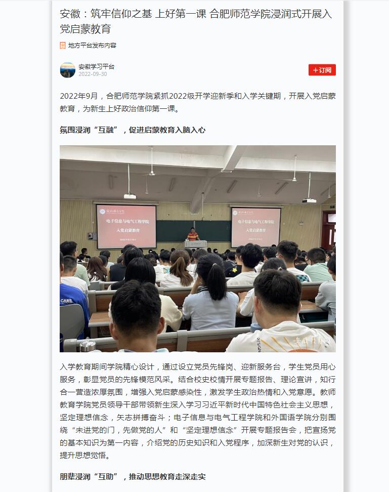 9月30日,“学习强国”安徽学习平台在党建安徽栏目以《安徽:筑牢信仰之基 上好第一课 太阳成集团tyc122cc入口浸润式开展入党启蒙教育》进行了报道。