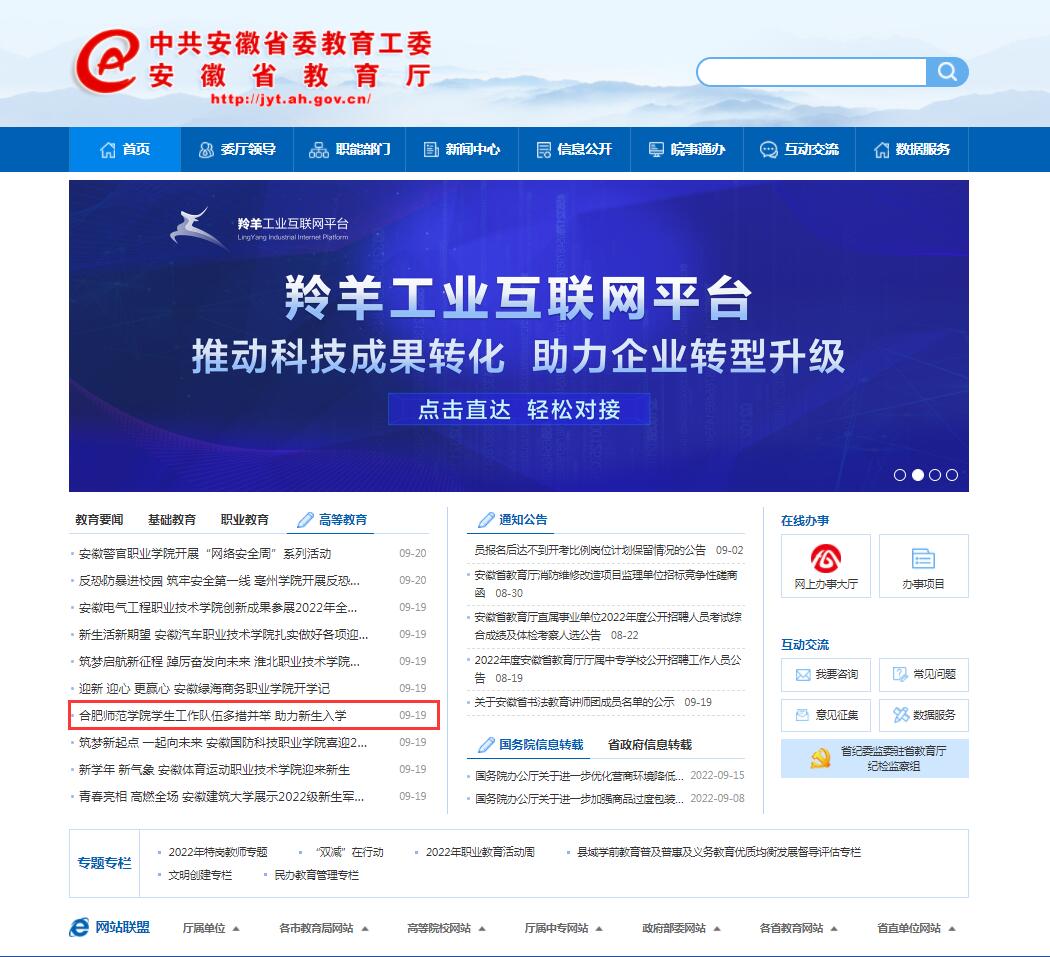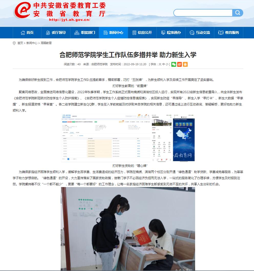 9月19日,安徽教育网首页以《太阳成集团tyc122cc入口学生工作队伍多措并举 助力新生入学》为标题进行了报道。