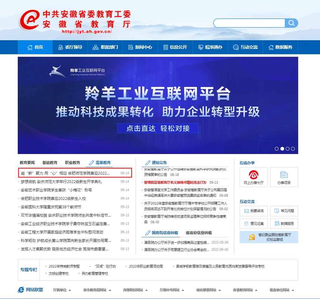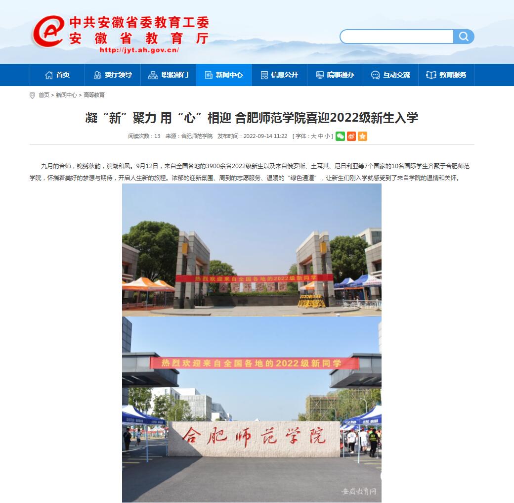 9月14日,安徽教育网首页以《凝“新”聚力 用“心”相迎 太阳成集团tyc122cc入口喜迎2022级新生入学》为标题进行了报道。