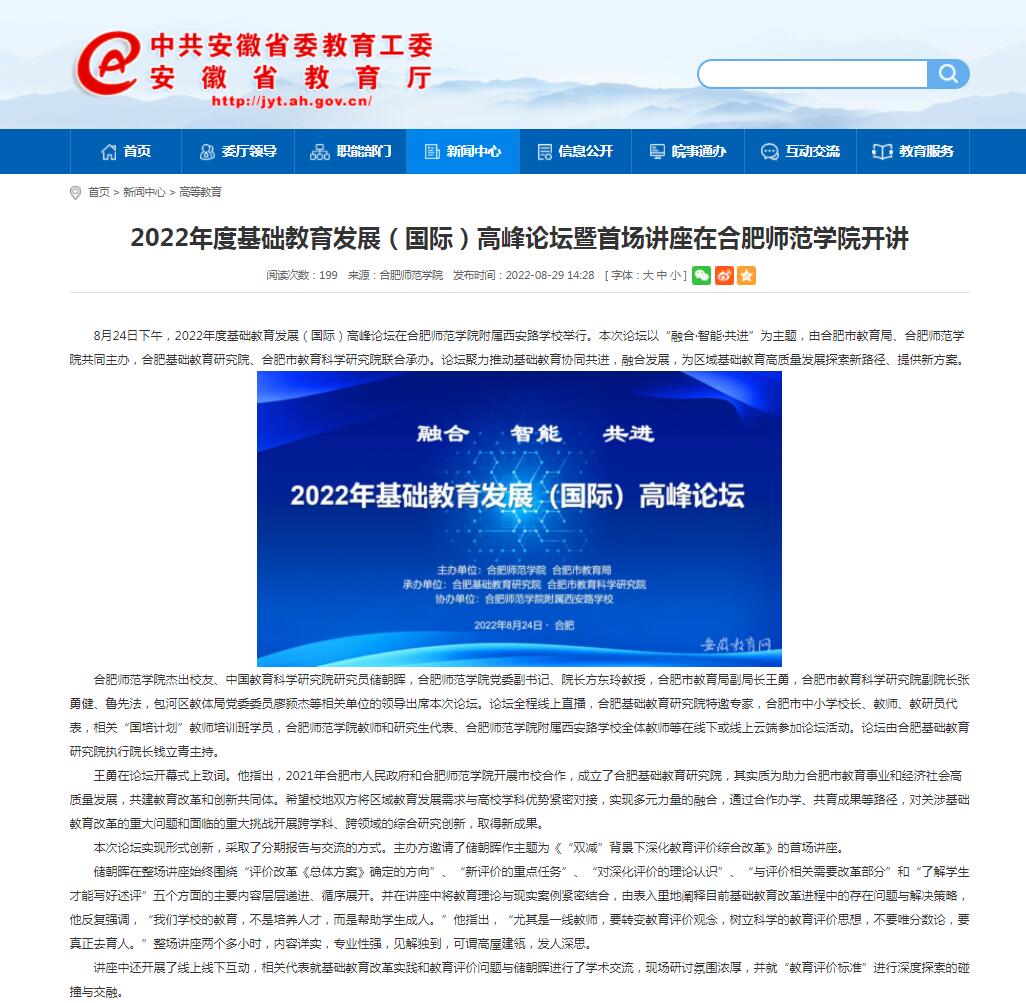 8月29日,安徽教育网以《2022年度基础教育发展(国际)高峰论坛暨首场讲座在太阳成集团tyc122cc入口开讲》为标题进行了报道。