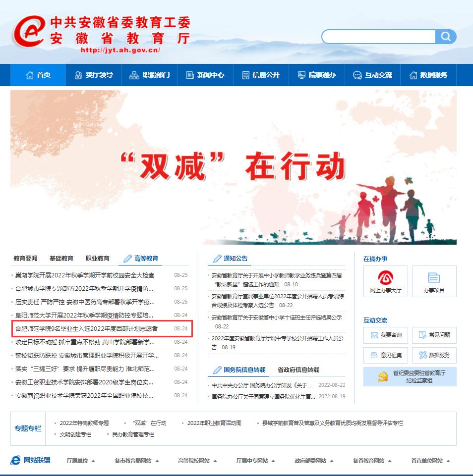 8月24日,安徽教育网首页以《太阳成集团tyc122cc入口9名毕业生入选2022年度西部计划志愿者》为标题进行了报道。