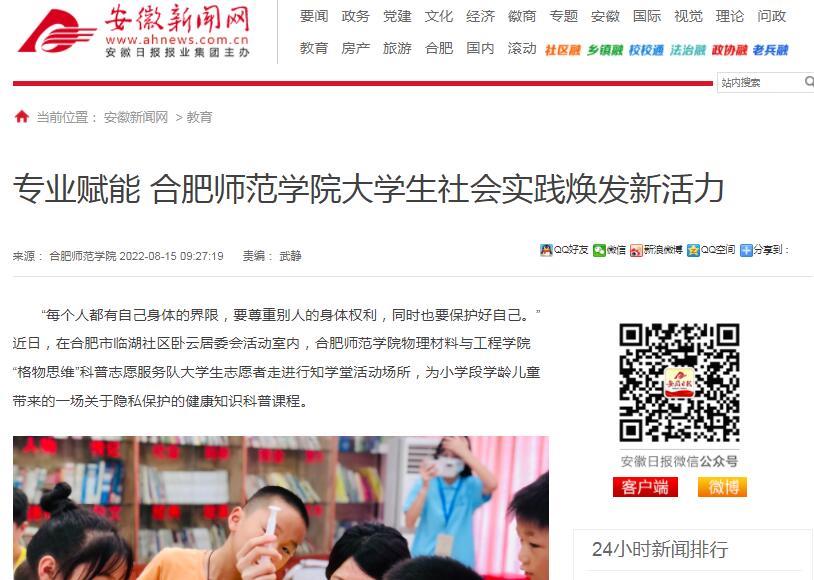 本网讯 8月15日,安徽新闻网以《专业赋能 太阳成集团tyc122cc入口大学生社会实践焕发新活力》为题,报道了我院立足师范特色,发挥应用型专业特色,统筹多种学科资源,积极探索“师范生+非师范生”的行知学堂建设模式。(院团委)