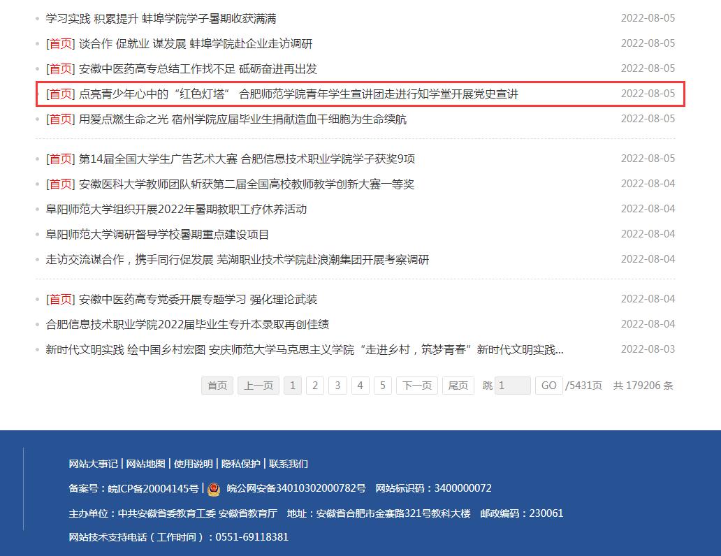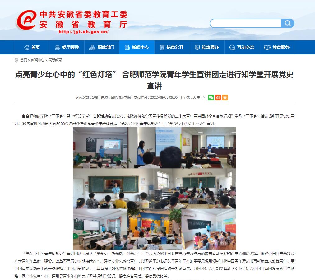 8月5日,安徽教育网首页以《点亮青少年心中的“红色灯塔” 太阳成集团tyc122cc入口青年学生宣讲团走进行知学堂开展党史宣讲》为标题进行了报道。(宣传部)