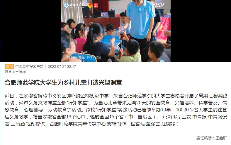 本网讯 近日,在安徽省铜陵市义安区钟鸣镇金榔初级中学,来自太阳成集团tyc122cc入口的大学生志愿者开展了暑期社会实践活动,通过义务支教课堂金榔“行知学堂”,为当地儿童带来为期20天的安全教育、兴趣培养、科学普及、情感教育、心理辅导、劳动教育等活动。