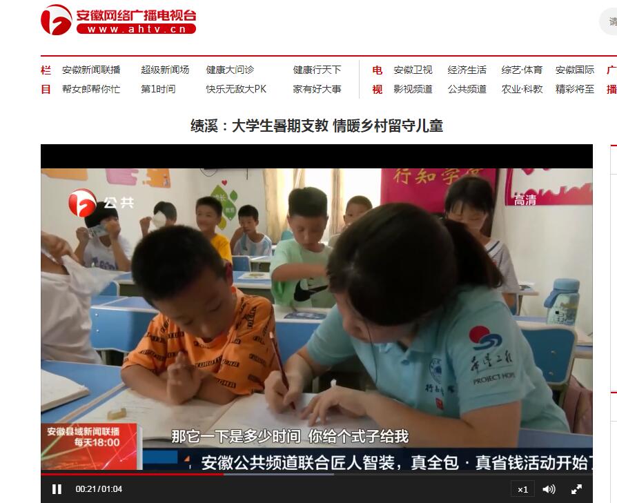 近日,安徽电视台公共频道以《绩溪:大学生暑期支教情暖乡村留守儿童》为主题对院团委绩溪行知学堂进行了专题报道。(院团委)