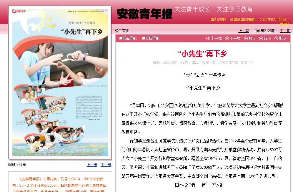 《安徽青年报》于07月29日(第2120期)以《行知“薪火”十年传承:“小先生”再下乡》为题对此进行了整版报道。(院团委)