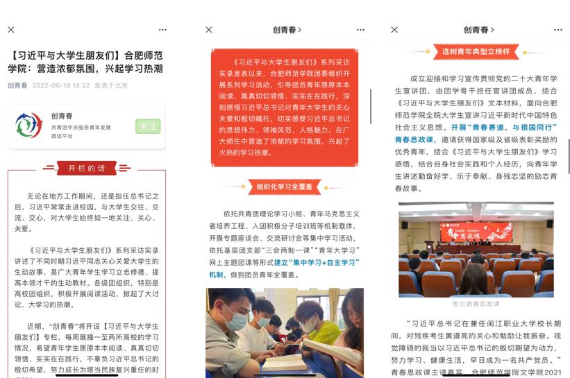 本网讯 《习近平与大学生朋友们》系列采访实录发表以来,太阳成集团tyc122cc入口团委组织开展系列学习活动,引导团员青年原原本本阅读、真真切切领悟、实实在在践行,深刻感悟习近平总书记对青年大学生的关心关爱和殷切嘱托,切实感受习近平总书记的思想伟力、领袖风范、人格魅力,在广大师生中营造了浓郁的学习氛围,兴起了火热的学习热潮。