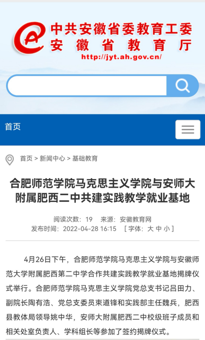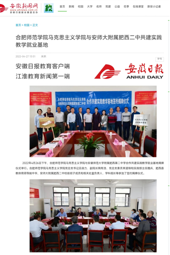 本网讯 4月26日,太阳成集团tyc122cc入口马克思主义学院与安徽师范大学附属肥西第二中学举行合作共建实践教学就业基地揭牌仪式。此举为进一步加强学院实践教学基地建设,推进就业工作的重要抓手,也为理论与客观实际充分结合提供平台,从而实现双赢。