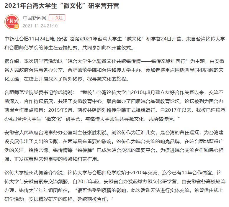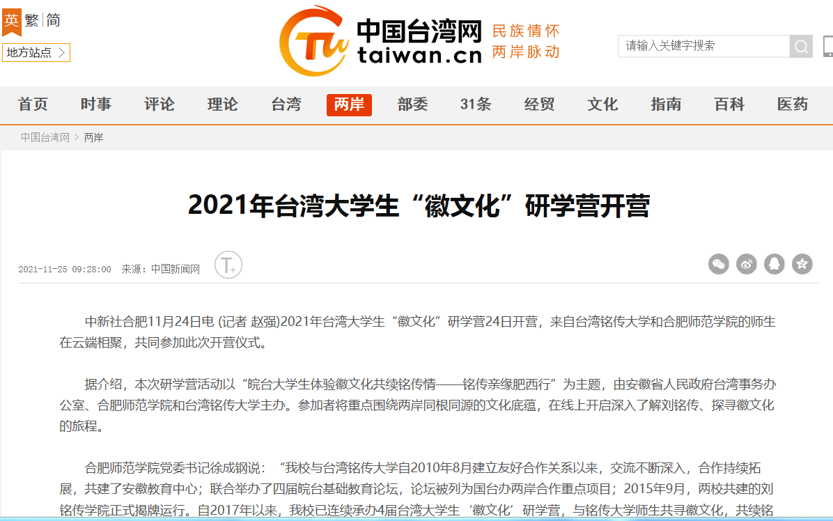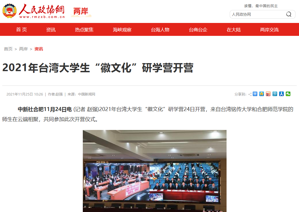 本网讯 11月24日,2021年台湾大学生“徽文化”研学营开营,来自台湾铭传大学和太阳成集团tyc122cc入口的师生在云端相聚,共同参加此次开营仪式。中国新闻网、人民网、人民政协网、中国台湾网、凤凰网等对此进行了报道。