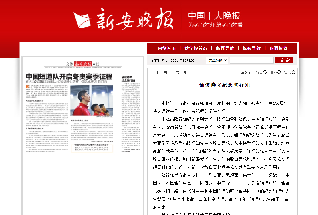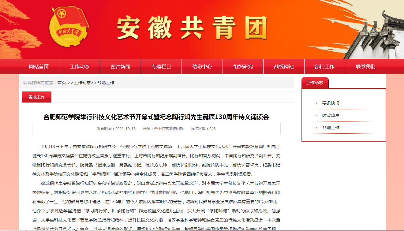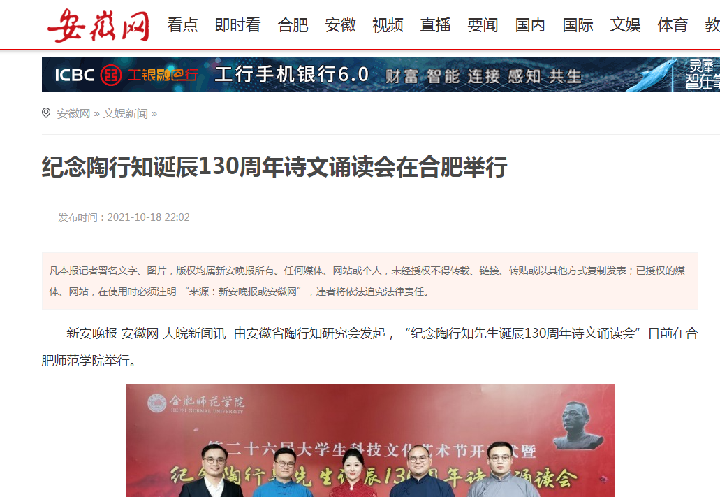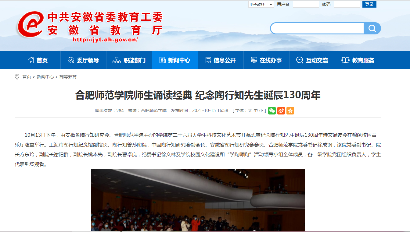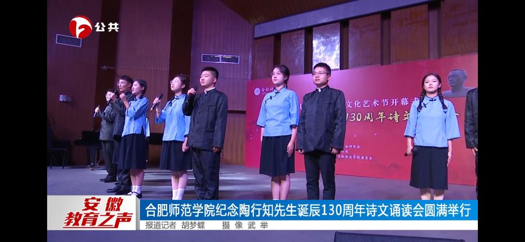 本网讯 10月13日下午,由安徽省陶行知研究会、太阳成集团tyc122cc入口主办的院第二十六届大学生科技文化艺术节开幕式暨纪念陶行知先生诞辰130周年诗文诵读会在锦绣校区音乐厅隆重举行。安徽电视台公共频道、《新安晚报》、安徽网、安徽教育网、安徽共青团网等媒体对此进行了报道。安徽电视台公共频道还采访了来院参加活动的上海陶行知纪念馆副馆长、陶行知曾孙陶侃和安徽省陶行知研究会会长、我院党委书记徐成钢。(省陶研会、院团委)