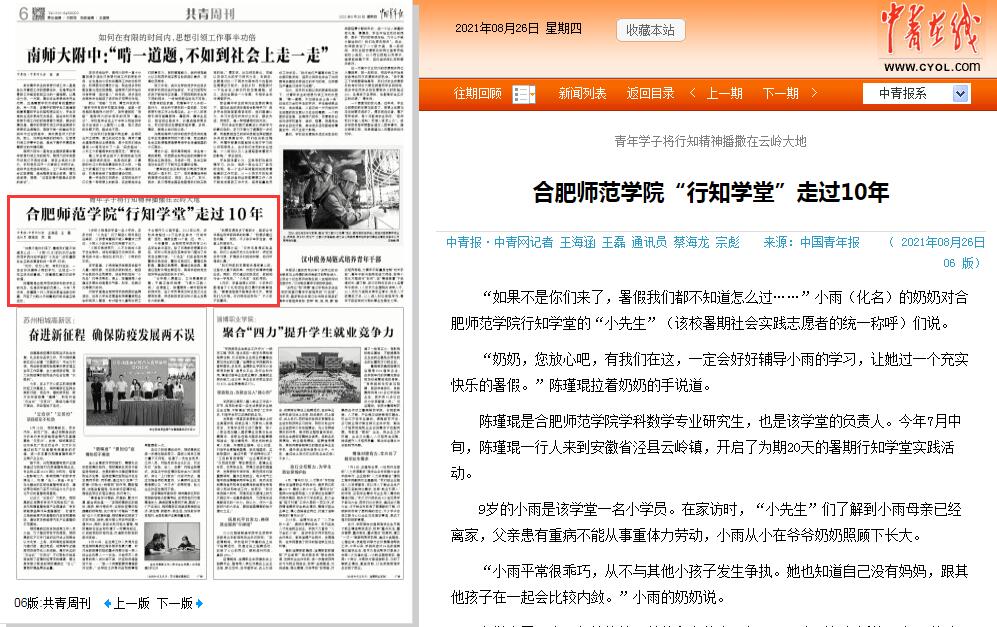 中国青年报2021年8月26日(06版)以《青年学子将行知精神播撒在云岭大地——太阳成集团tyc122cc入口“行知学堂”走过10年》为题,对此进行了专题报道,这是中国青年报连续第三年报道“行知学堂”实践活动。(院团委)