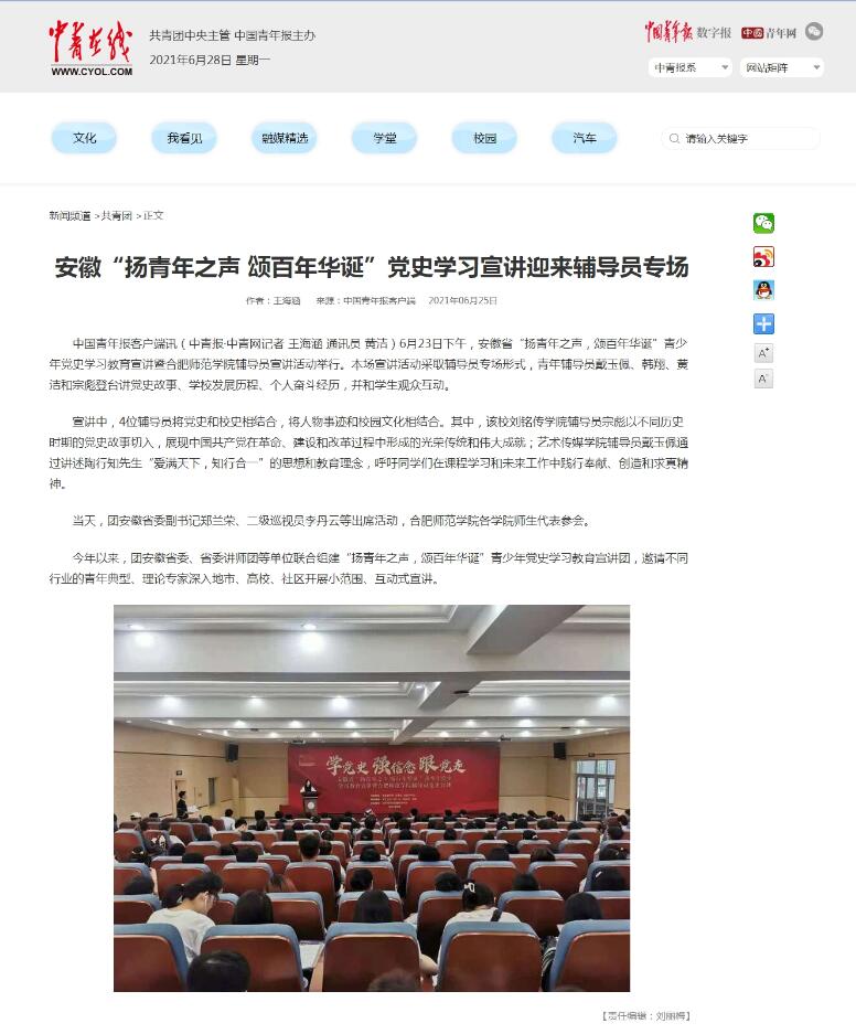 本网讯 6月23日下午,安徽省“扬青年之声,颂百年华诞”青少年党史学习教育宣讲暨太阳成集团tyc122cc入口辅导员宣讲活动举行。本场宣讲活动采取辅导员专场形式,青年辅导员戴玉佩、韩翔、黄洁和宗彪登台讲党史故事、学校发展历程、个人奋斗经历,并和学生观众互动。