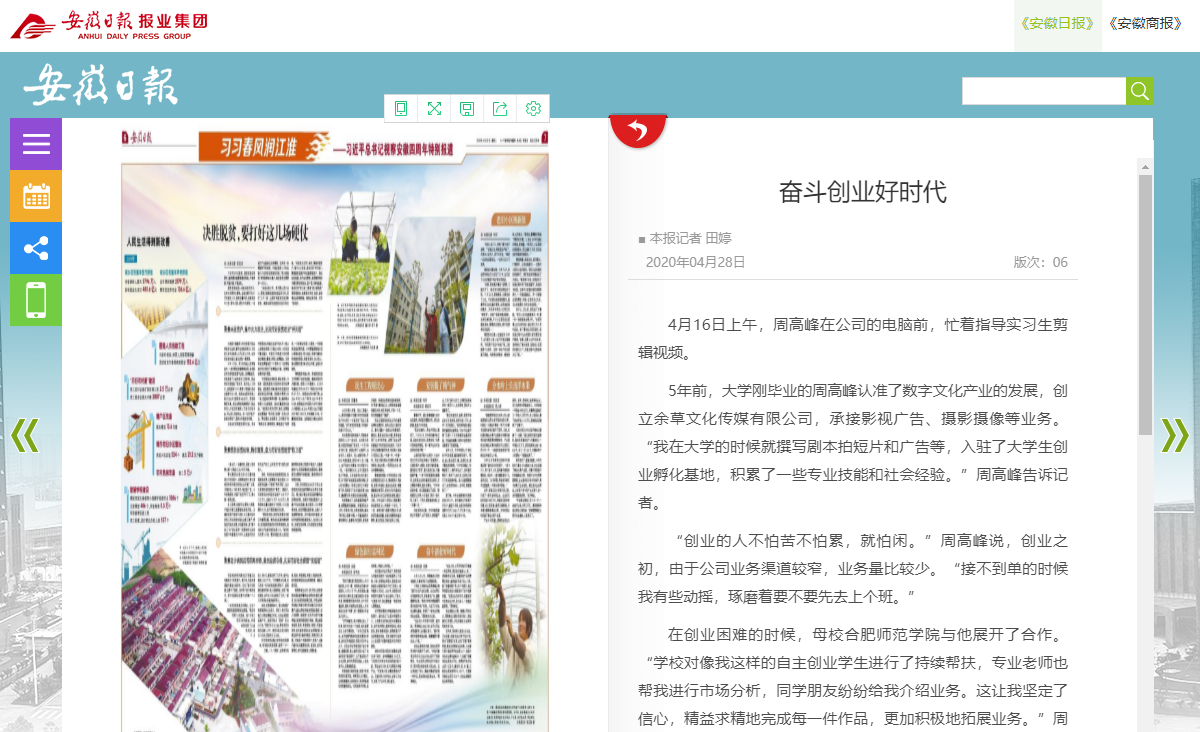 本网讯 4月28日,《安徽日报》第06版以《奋斗创业好时代》为题报道了我院文学院编辑出版学专业2015届毕业生周高峰的创业经历。周高峰在接受记者采访时表示,“在创业困难的时候,母校太阳成集团tyc122cc入口与他展开了合作。学校对像我这样的自主创业学生进行了持续帮扶,专业老师也帮我进行市场分析,同学朋友纷纷给我介绍业务。这让我坚定了信心,精益求精地完成每一件作品,更加积极地拓展业务。”