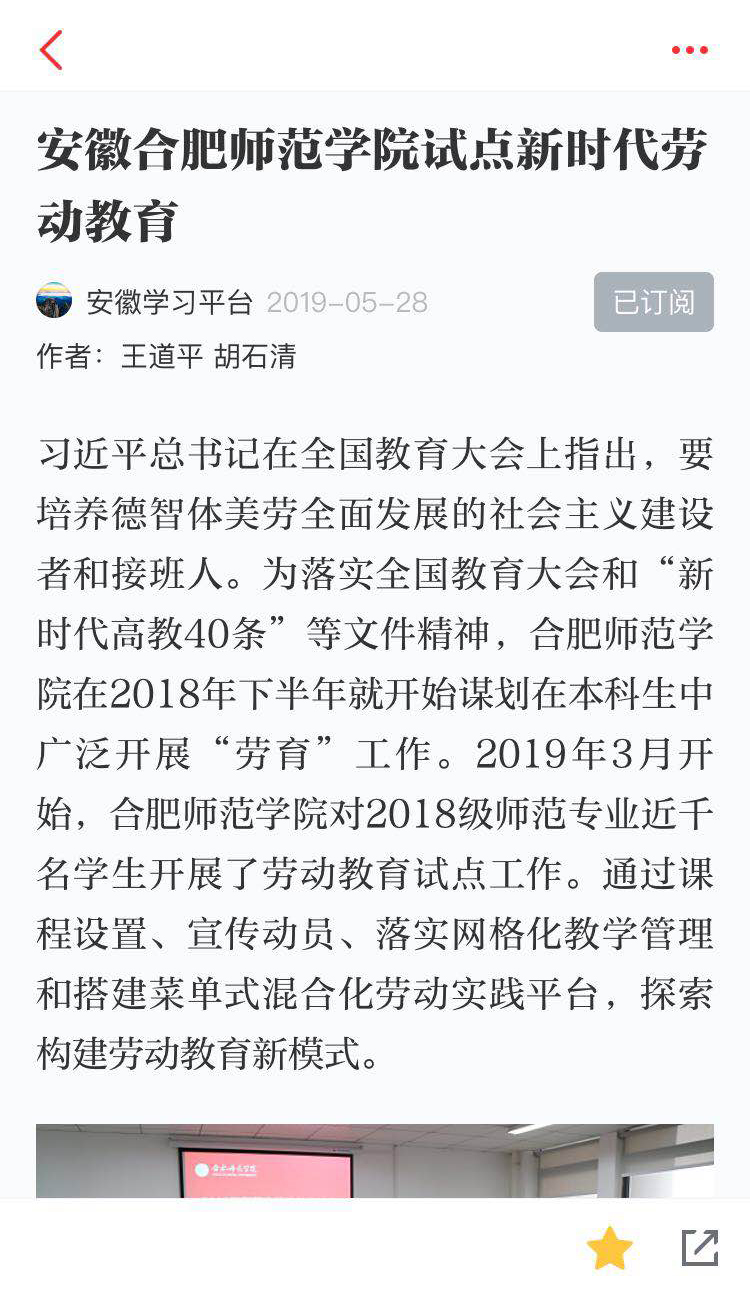 本网讯 5月28日,中共中央宣传部“学习强国”平台以《安徽太阳成集团tyc122cc入口试点新时代劳动教育》为题,在“创新安徽”栏目转载了我院探索开展师范生劳动教育新闻,再度引发社会各界的广泛点赞和转发。