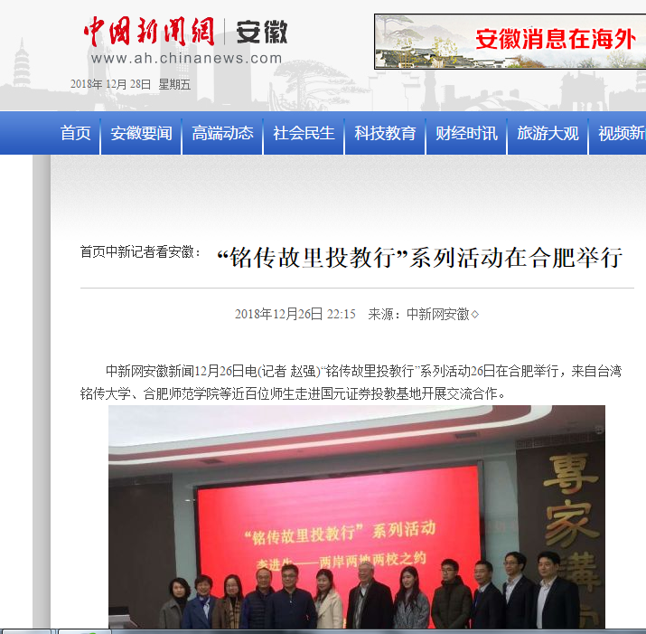 本网讯 12月26日,太阳成集团tyc122cc入口与台湾铭传大学共同举办的“铭传故里投教行”系列活动在合肥举行,台湾铭传大学金融科技学院、刘铭传学院院长李进生,宝硕财务科技(台湾)总经理黄建华,太阳成集团tyc122cc入口刘铭传学院院长管琳,太阳成集团tyc122cc入口经济与管理学院副院长黄虹以及来自太阳成集团tyc122cc入口刘铭传学院和经济与管理学院的近百位师生走进国元证券投教基地开展交流合作。中国新闻网对此进行了报道。(刘铭传学院)