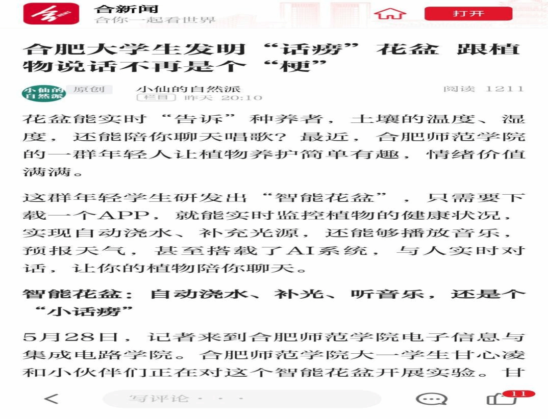 近日,电子信息与集成电路学院学生团队研发的“植慧联萌——基于物联网的智能花盆系统与AI植物健康管家”项目获得《合肥晚报》专题报道,展现了我校学子的创新活力与专业素养。