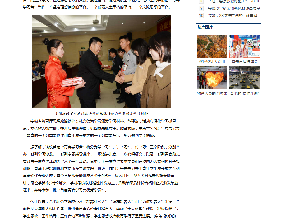 本网讯 11月23日下午,我院首届大学生“青春学习营”在锦绣校区学术报告厅正式开营。院党委副书记吴昕春、省教育厅思政处处长林兴德出席,院相关部门负责人、各二级学院党总支书记、副书记,全体辅导员,首届大学生“青春学习营”全体学员及部分学生代表,共240余人参加活动。新华网安徽频道、中安在线等对此进行了报道。(党委学工部:葛畅)