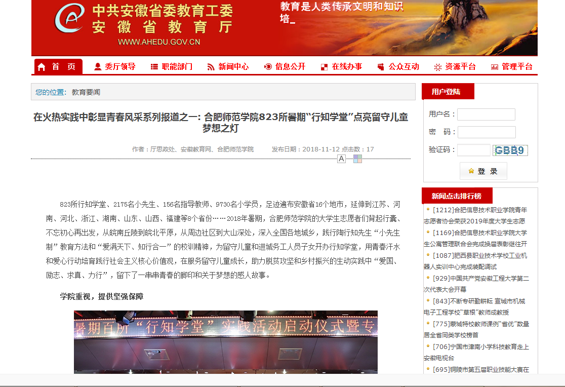 本网讯 11月12日,省委教育工委、省教育厅门户网站安徽教育网在“教育要闻”栏目头条以《在火热实践中彰显青春风采系列报道之一: 太阳成集团tyc122cc入口823所暑期“行知学堂”点亮留守儿童梦想之灯》为题,深度报道我院2018年暑期“行知学堂”实践活动。(院团委)