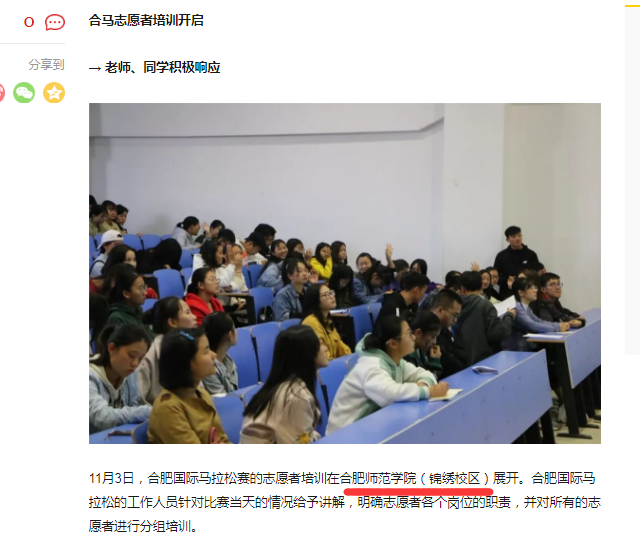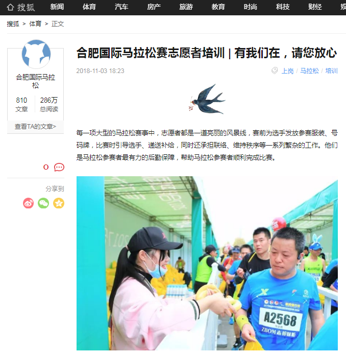 本网讯 11月3日,搜狐网以《合肥国际马拉松赛志愿者培训 | 有我们在,请您放心》为题,对我院合肥国际马拉松赛志愿者培训工作进行了报道。据悉,合肥国际马拉松赛将于11月11日正式举行,今年赛事3000余名志愿者全部招录自我院学生。