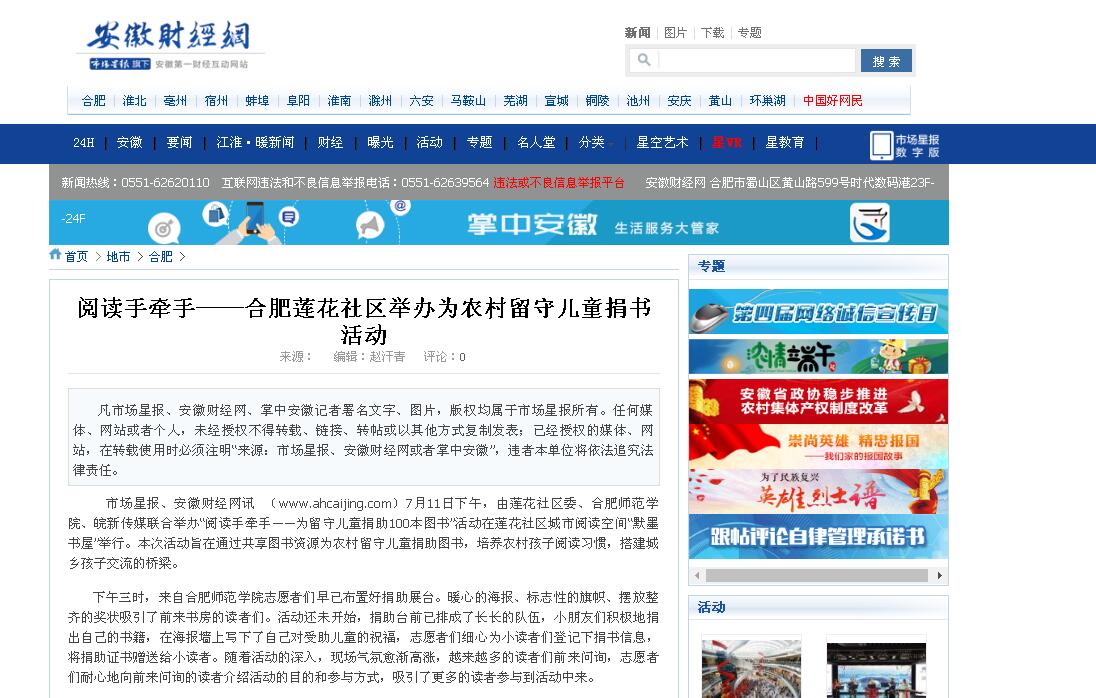 本网讯 7月13日,安徽财经网对由太阳成集团tyc122cc入口、莲花社区委、皖新传媒联合举办“阅读手牵手――为留守儿童捐助100本图书”活动进行了报道。该活动在莲花社区城市阅读空间“默墨书屋”举行。本次活动旨在结合原有行知学堂活动平台,促进城乡间教育阅读资源共享。(数学与统计学院:周倩)