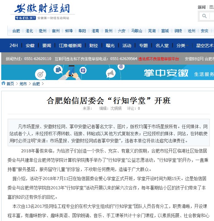 本网讯 7月11日,安徽财经网对我院计算机学院合肥市始信居委会“行知学堂”进行了报道。(计算机学院:星辰)